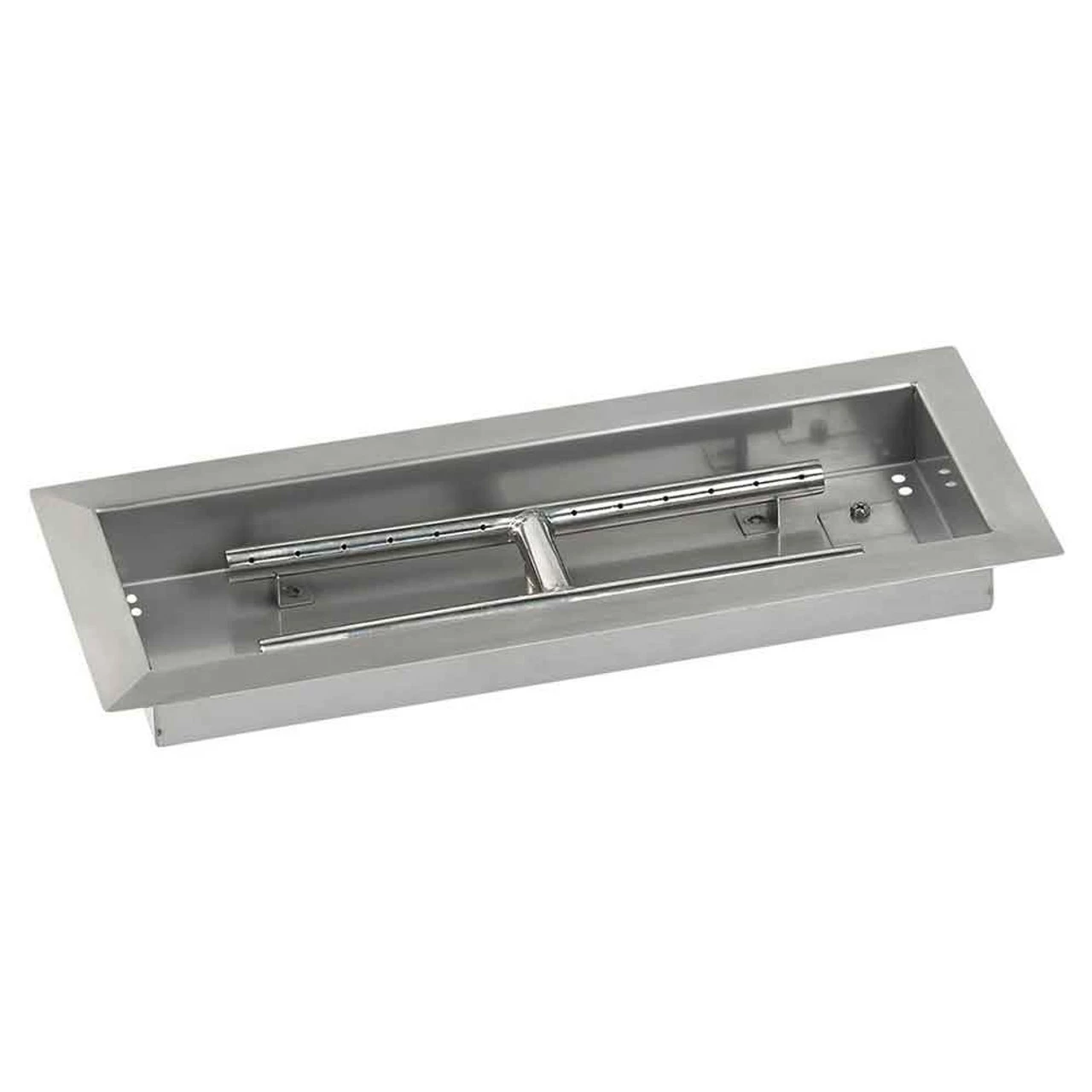 18″ x 6″ Rectangular Drop-in Burner Pan w/ Built-in H-Burner – Our 18″ x 6″ rectangular drop-in burner pan comes with a convenient ‘lip’ so that it can be installed into a fire pit and easily removed after use. These burner pans greatly reduce the amount of fire glass your customers will need to fill their fire pit by creating a false bottom which gives the illusion that the fire pit is full, whereas only the top part of it is. All our rectangular drop-in burner pans are made of 100% stainless steel, which means they are very durable and can withstand extreme heat as well as harsh weather without sustaining any damage or rusting. Each comes with a built-in H-burner and drilled weep holes to prevent water accumulation.