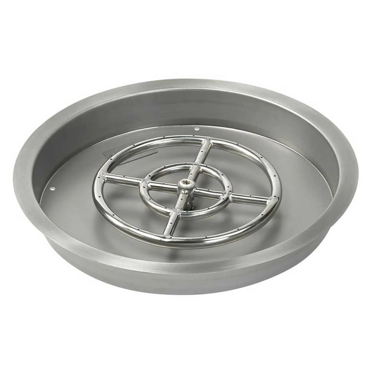 19″ Round Drop-In Burner Pan – This 19″ round drop-in burner pan comes with a convenient ‘lip’ so that it can be installed into your circular fire pit and easily removed after use. It also greatly reduces the amount of fire glass your customers will need to fill their fire pit by creating a false bottom which gives the illusion that the fire pit is full, whereas only the top part of it is. All our round drop-in burner pans are made of 100% stainless steel, which means they are very durable and can withstand extreme heat as well as harsh weather without sustaining any damage or rusting. Each comes with drilled weep holes to prevent water accumulation.