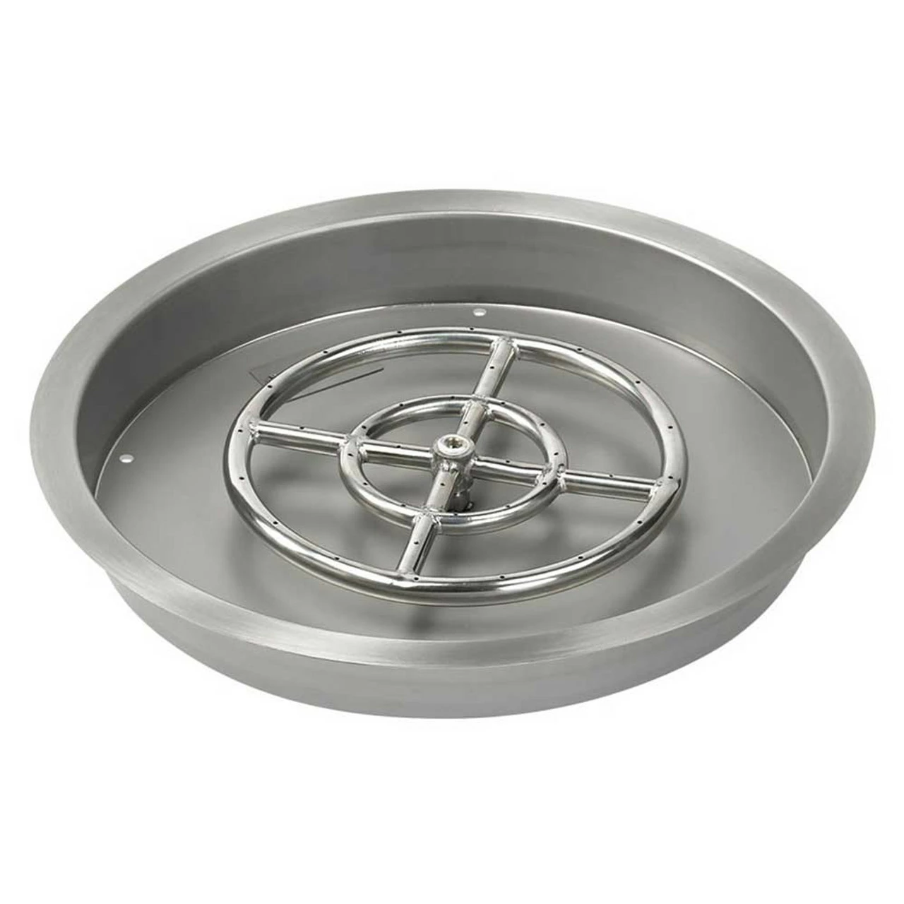 19″ Round Drop-In Burner Pan – This 19″ round drop-in burner pan comes with a convenient ‘lip’ so that it can be installed into your circular fire pit and easily removed after use. It also greatly reduces the amount of fire glass your customers will need to fill their fire pit by creating a false bottom which gives the illusion that the fire pit is full, whereas only the top part of it is. All our round drop-in burner pans are made of 100% stainless steel, which means they are very durable and can withstand extreme heat as well as harsh weather without sustaining any damage or rusting. Each comes with drilled weep holes to prevent water accumulation.