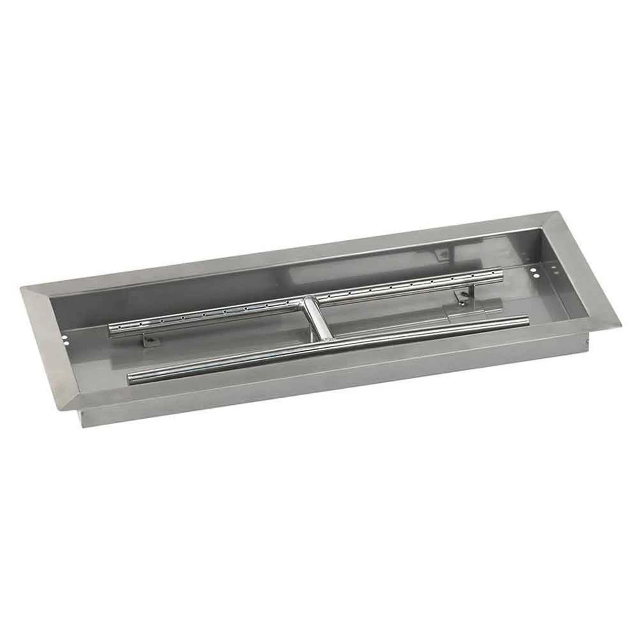 24″ x 8″ Rectangular Drop-in Burner Pan w/ Built-in H-Burner – Our 24″ x 8″ rectangular drop-in burner pan comes with a convenient ‘lip’ so that it can be installed into a fire pit and easily removed after use. These burner pans greatly reduce the amount of fire glass your customers will need to fill their fire pit by creating a false bottom which gives the illusion that the fire pit is full, whereas only the top part of it is. All our rectangular drop-in burner pans are made of 100% stainless steel, which means they are very durable and can withstand extreme heat as well as harsh weather without sustaining any damage or rusting. Each comes with a built-in H-burner and drilled weep holes to prevent water accumulation.
