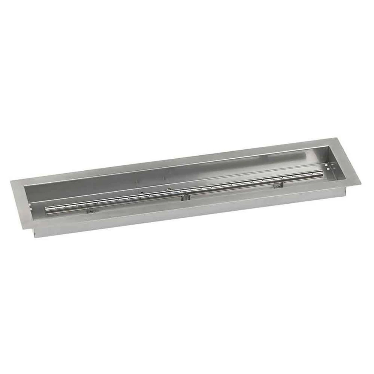 30″ x 6″ Linear Channel Drop-in Burner Pan w/ Built-in T-Burner – Our 30″ x 6″ linear drop-in burner pan comes with a convenient ‘lip’ so it can be installed into your DIY fire pit and easily removed after use. These burner pans greatly reduce the amount of fire glass your customers will need to fill their fire pit by creating a false bottom which gives the illusion that the fire pit is full, whereas only the top part of it is. All our linear drop-in burner pans are made of 304 stainless steel, which means they are very durable and can withstand extreme heat as well as harsh weather without sustaining any damage or rust. Each comes with a built-in T-burner, 1/2 inch gas inlet and drilled weep holes to prevent water accumulation.
