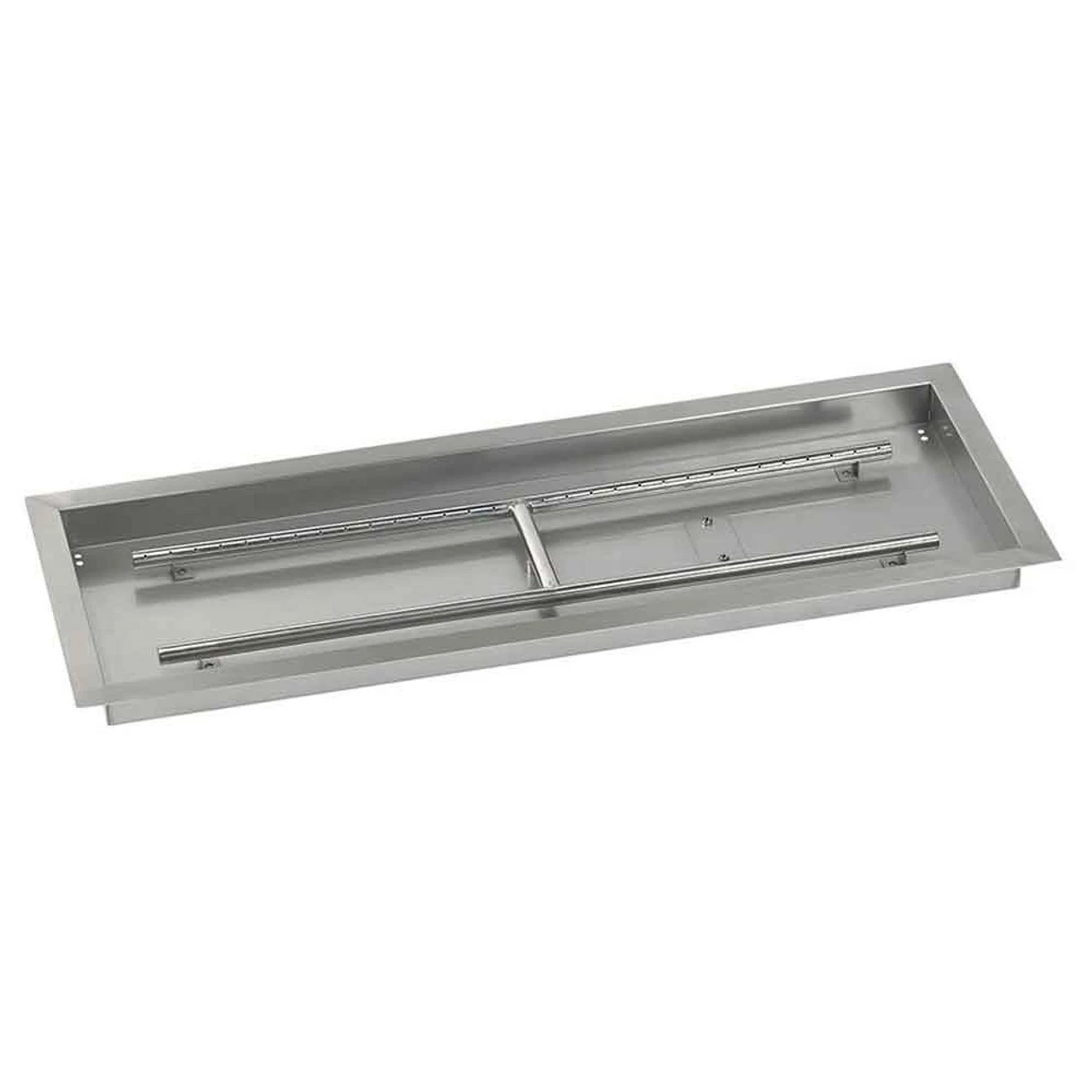 36″ x 12″ Rectangular Drop-in Burner Pan w/ Built-in H-Burner – Our 36″ x 12″ rectangular drop-in burner pan comes with a convenient ‘lip’ so that it can be installed into a fire pit and easily removed after use. These burner pans greatly reduce the amount of fire glass your customers will need to fill their fire pit by creating a false bottom which gives the illusion that the fire pit is full, whereas only the top part of it is. All our rectangular drop-in burner pans are made of 100% stainless steel, which means they are very durable and can withstand extreme heat as well as harsh weather without sustaining any damage or rusting. Each comes with a built-in H-burner and drilled weep holes to prevent water accumulation.