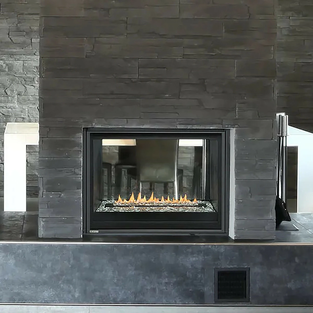 The Divine See Through – double the impact with maximized flame visibility. The H38FSD is a see through direct vent fireplace characterized by a classic square viewing area. Rock or tile can be installed over the firebox frame for a clean finish look.