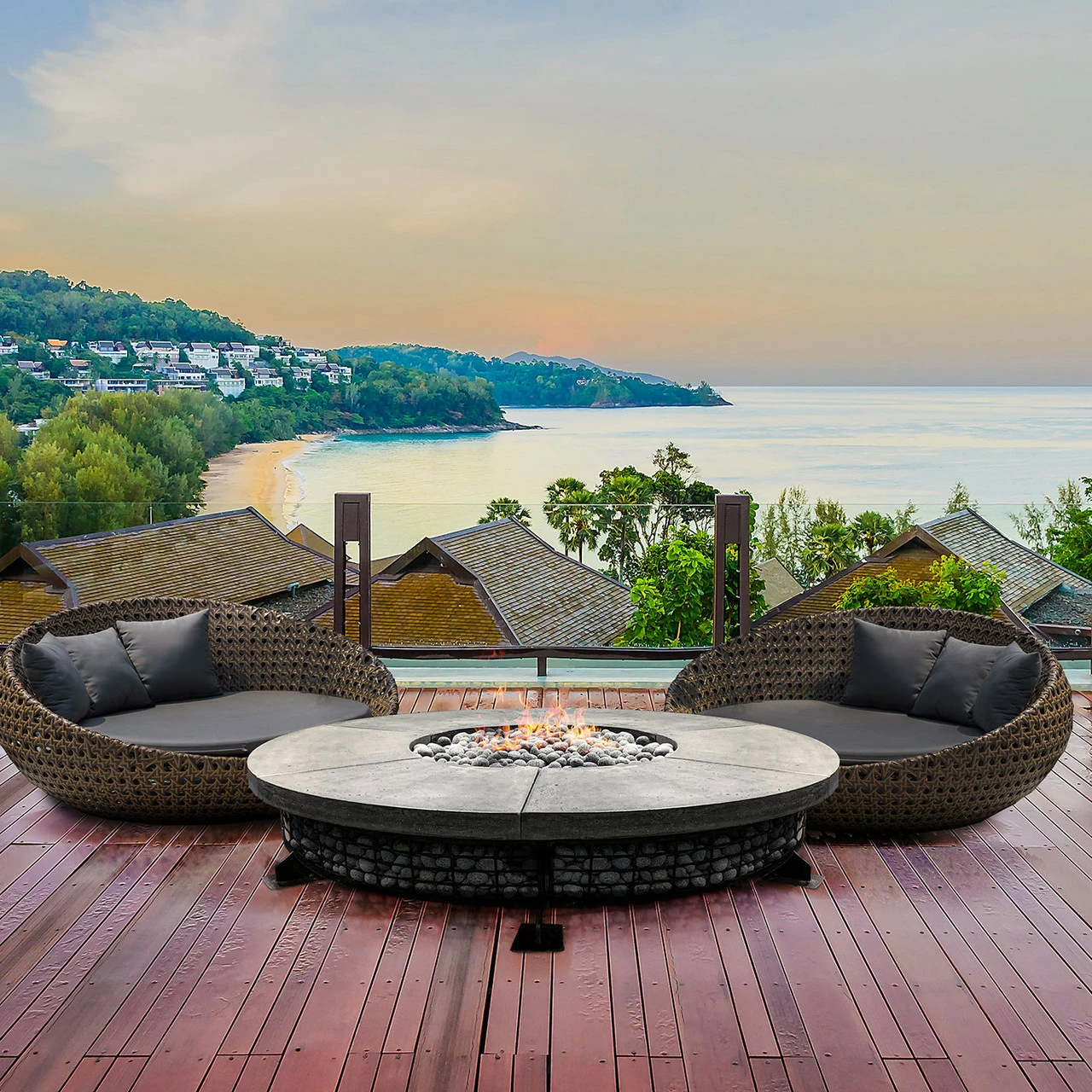 The fire pit comes complete with tumbled lava rock. The smooth volcanic rock creates a stunning contrast to the beautiful flames of any gas fire feature while the lava rock is heat resistant.