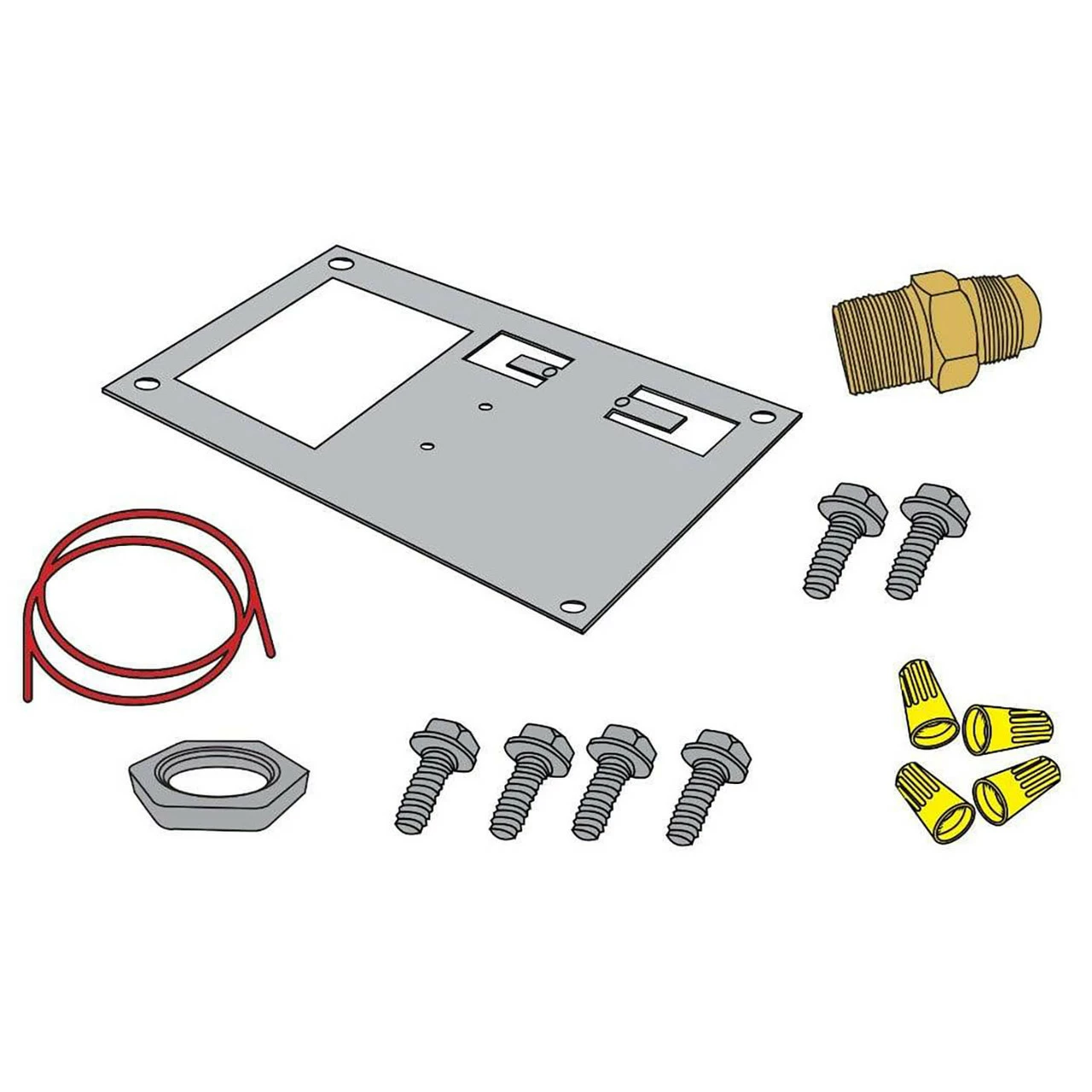 Includes plate-AWS, (4) 10-24 x 1/2″ screws, (1) brass nut, (2) 8-18 x 1/2″ screws, (4) wire nuts, (1) 1/2″NPT x 1/2″ flare and (1) red extension wire.
