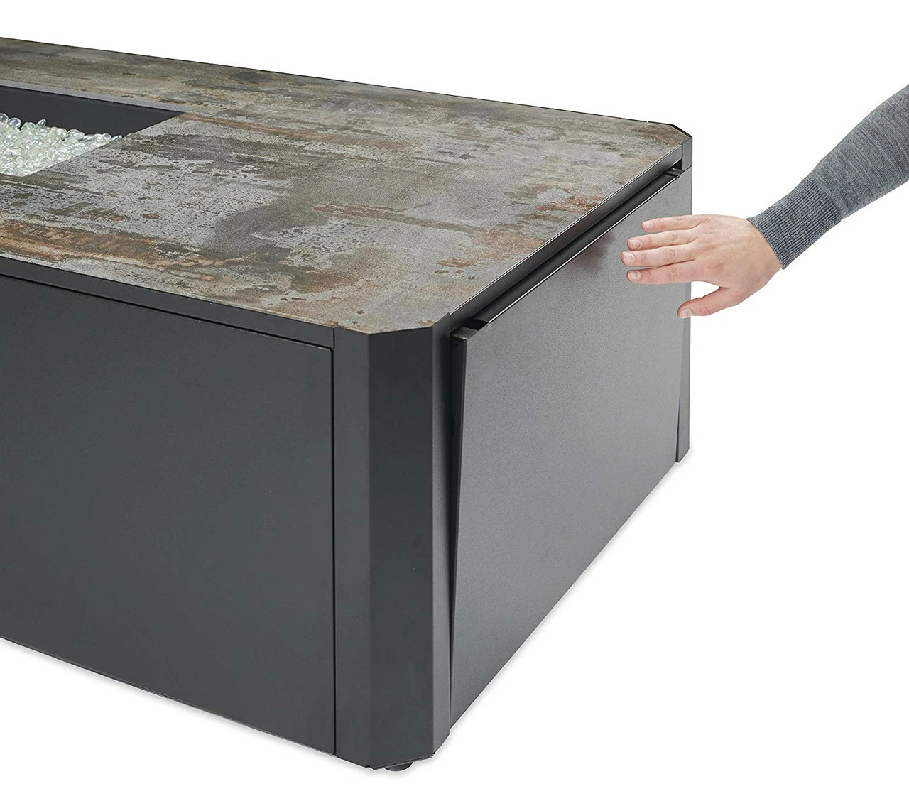 The Kinney Gas Fire Pit Table features an ultra-modern design that is perfect for entertaining and relaxing in the backyard. The modern low-profile base compliments the contemporary Ultracompact surface top. Enjoy the warm glow of the 12×24″ Black Crystal Fire® Plus Burner while you use the extra table top space for easy outdoor entertaining.