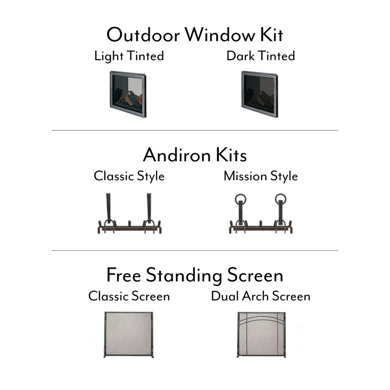 - Optional andirons evoke the look of a traditional hearth, in Mission and Classic styles.