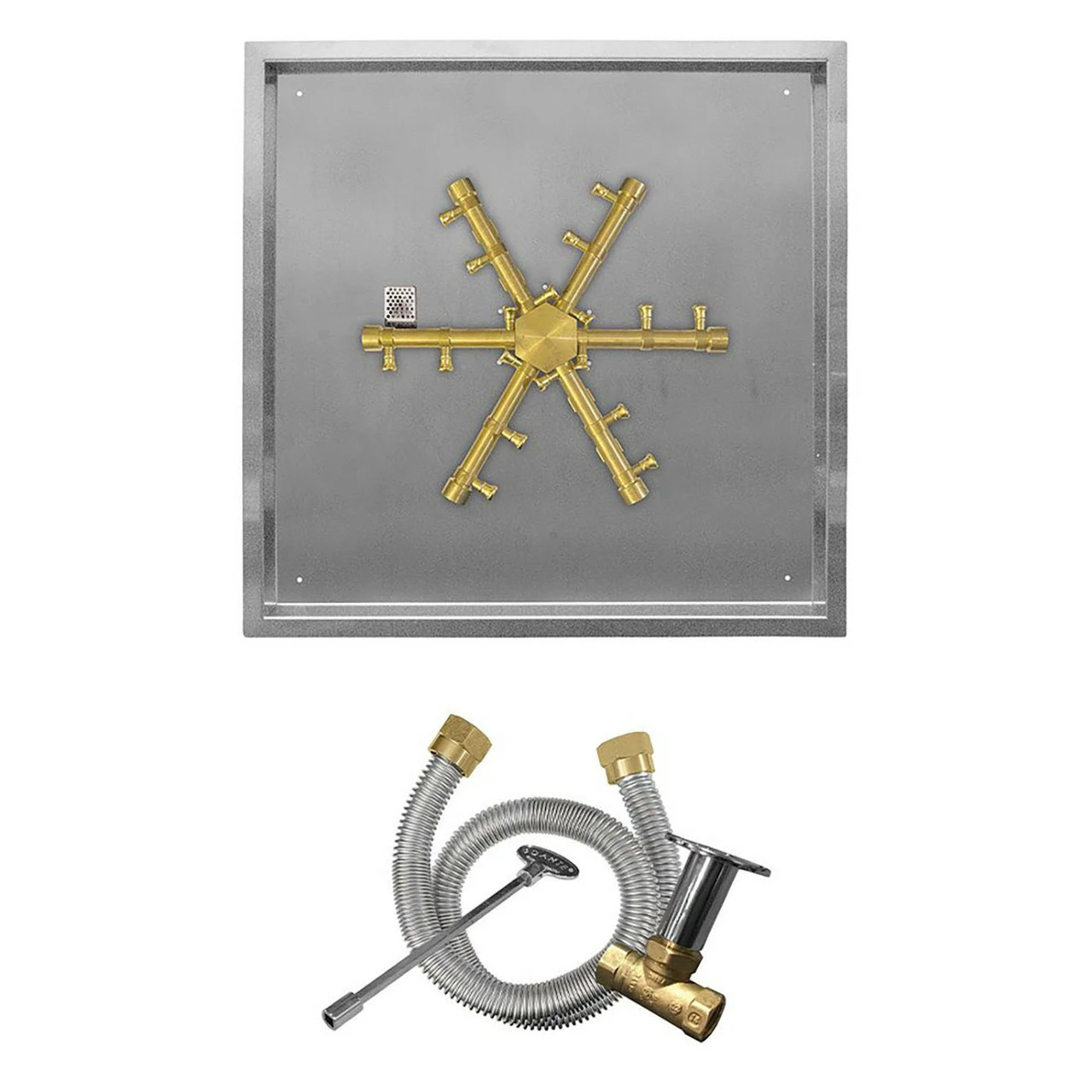 Firegear FPB-SPSBRMT Pro Series Match Light Ignition Gas Fire Pit Burner Kit with Square Drop Pan & Brass Burning Spur provides a high quality burner system to complete your gas fire pit project. This system features a heavy-duty brass burner for commercial-quality durability and a premium stainless steel pan. The unique “spur” burner design offers a full and natural-looking flame appearance, while the included Match Throw Ignition (MT) system offers simplicity, reliability, and economical pricing for your outdoor setup.