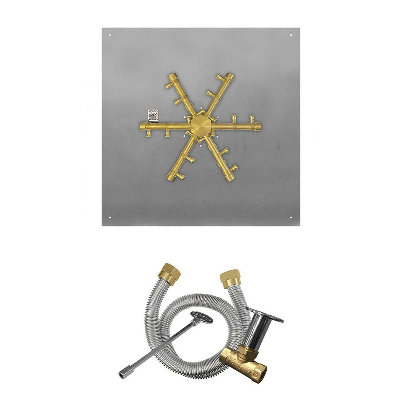Firegear FPB-SFPBRMT Pro Series Match Light Ignition Gas Fire Pit Burner Kit with Square Flat Pan & Brass Burning Spur provides a high quality burner system to complete your gas fire pit project. This system features a heavy-duty brass burner for commercial-quality durability and a premium stainless steel pan. The unique “spur” burner design offers a full and natural-looking flame appearance, while the included Match Throw Ignition (MT) system offers simplicity, reliability, and economical pricing for your outdoor setup.