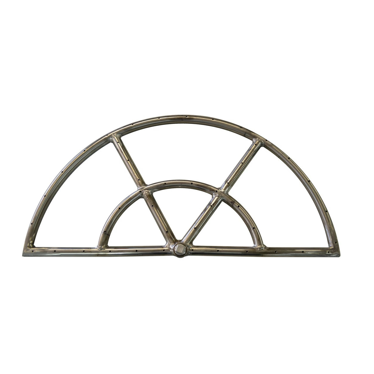 The Outdoor Plus Stainless Steel Half Moon Gas Fire Pit Burner offers a premium fire pit burner alternative for your perfect patio. The half moon fire pit burner is made from 304 stainless steel to ensure durability and longevity while the drilled holes provide consistent, tall flames that your friends and family can enjoy for years to come. The half moon burner goes well with any new or existing custom fire pit and offers 6 different sizes ranging from 18-inches to 48-inches, while the raised gas inlets help prevent water from entering your gas line. With a BTU capacity ranging from 80,000 to 175,000, this versatile burner ensures a strong, warm flame and is suited for natural gas or propane application.