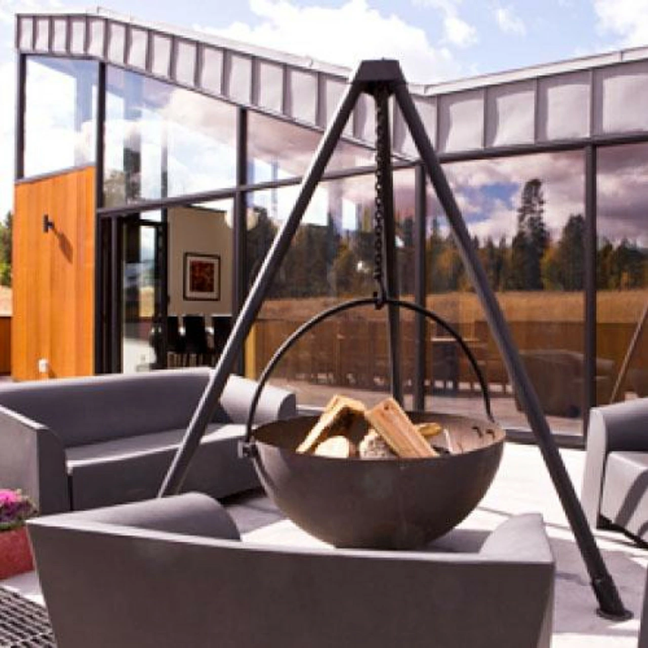 A Cowboy Cauldron basin is suspended in the air. This is amazing for lots of reasons. First, you can get your feet right up underneath the fire on a cold day. Niiiceโฆ Try doing that with a fire pit!